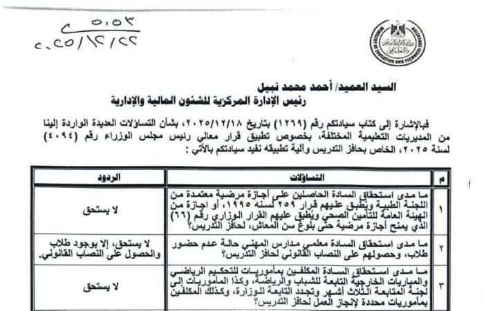 ردت وزارة التربية والتعليم والتعليم الفني، على التساؤلات الواردة إليها من المديريات التعليمية المختلفة بخصوص تطبيق قرار رئيس مجلس الوزراء رقم (٤٠٩٤) لسنة ۲۰۲٥، الخاص بحافز التدريس وآلية تطبيقه.