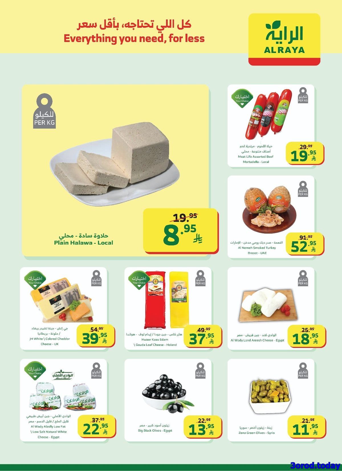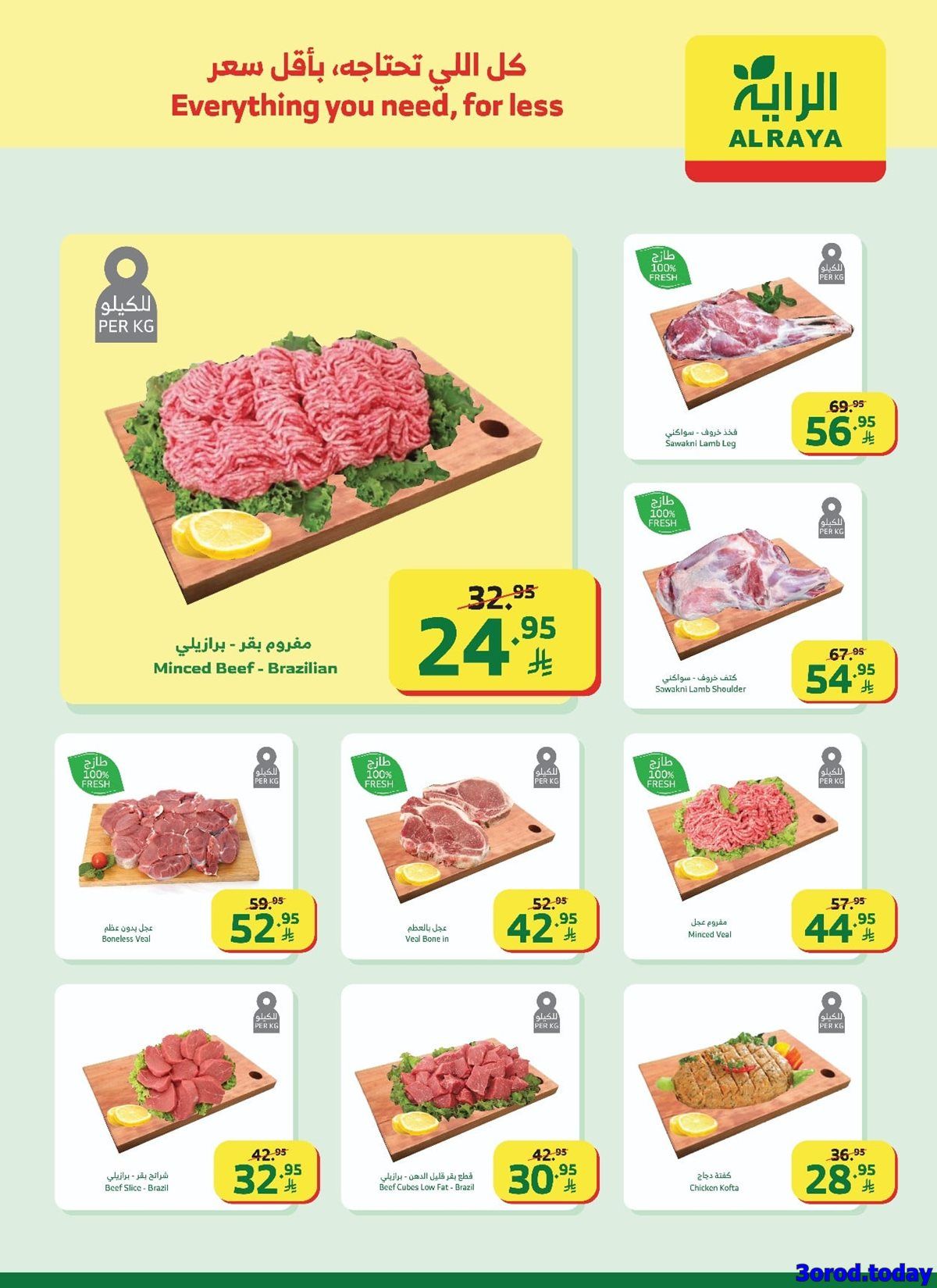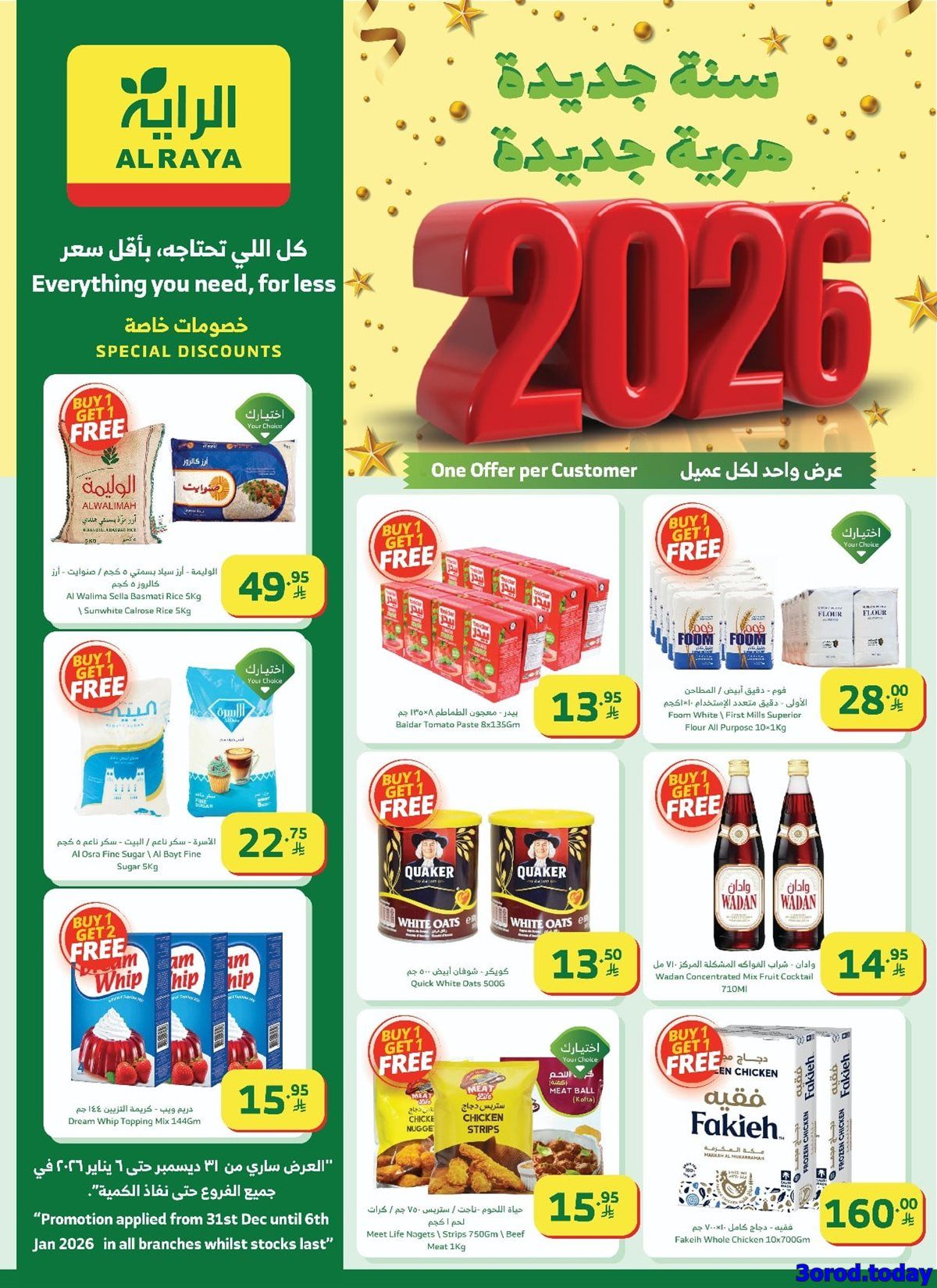 عروض أسواق الراية الأربعاء 11 رجب 1447هـ الموافق 31 ديسمبر 2025 تبدأ العروض بتشكيلة غذائية تحتوي على المعكرونة وزيت الكتان ومعجون السمسم ودبس والسمن النباتي ثم تمتد إلى أجهزة منزلية و تشمل مروحة حائط وسخان فوري وخلاط معدني وفرن كهربائي وجهاز فرم خضار و مججموعة من اللحوم و الخضروات الطازجة باقل الاسعار