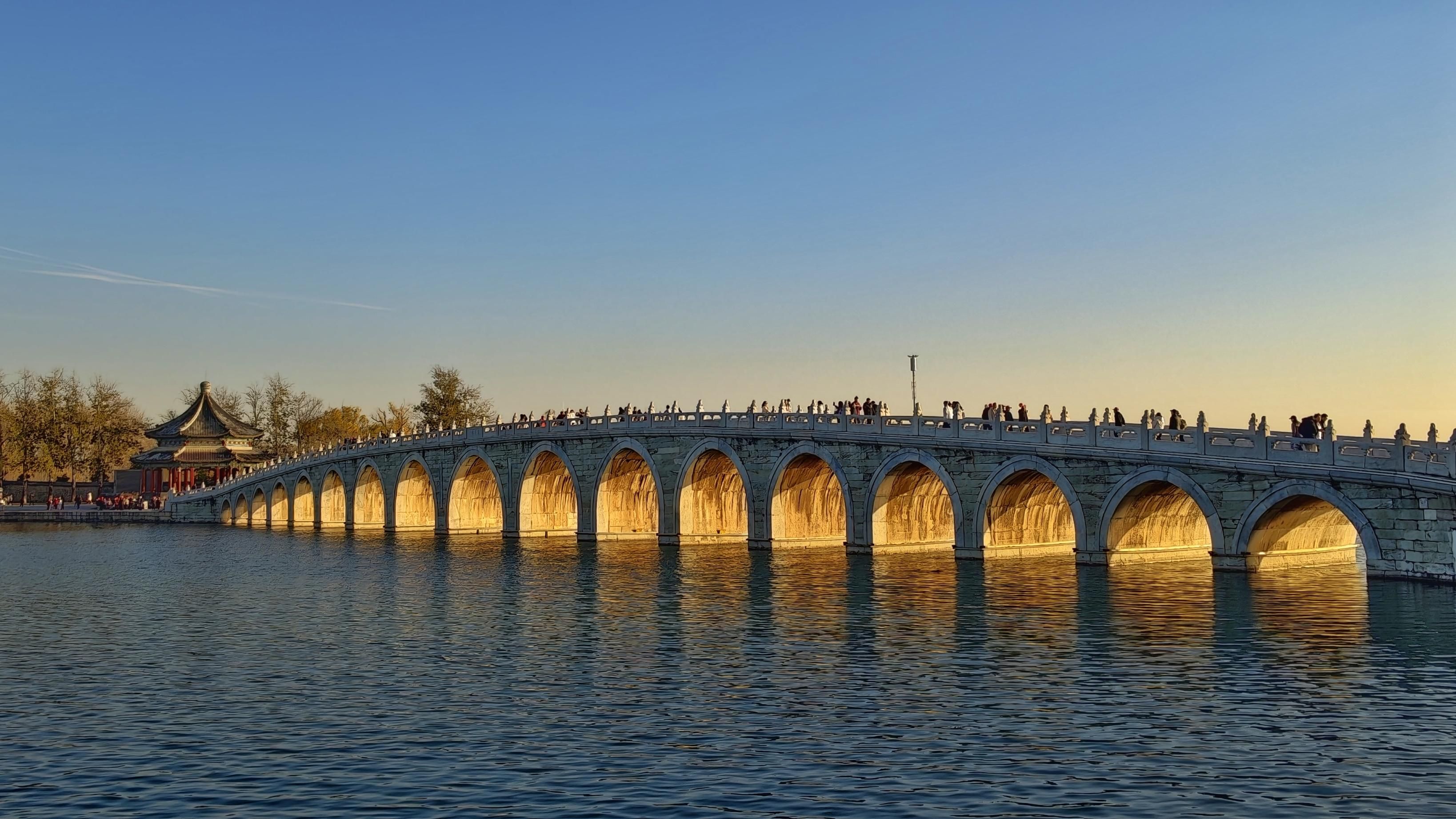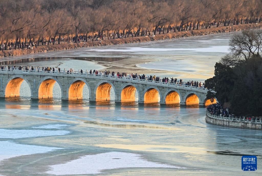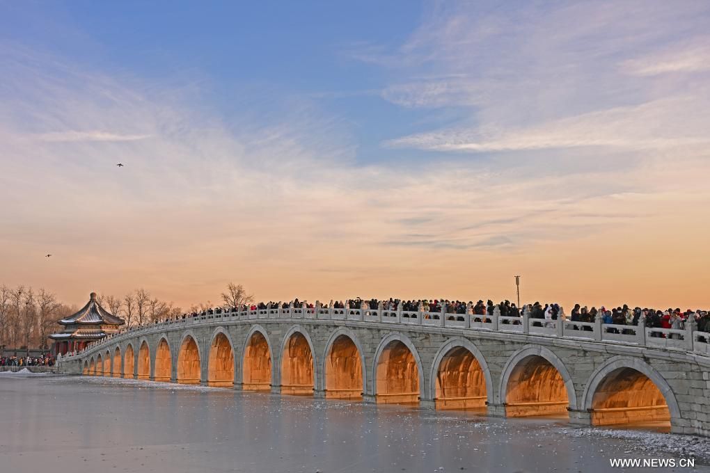 ظهر القصر الصيفي غرب العاصمة بكين مؤخرا في مشهد ساحر، حيث تسللت أشعة الشمس الذهبية عبر جسور الأقواس السبعة عشر، وأضائتها بألوانها المبهرة، وذلك حسبما نشرموقع وكالة الأنباء الصينية شنخوا صورا