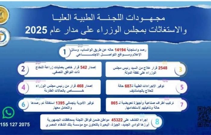 تابع الدكتور مصطفى مدبولي، رئيس مجلس الوزراء، جهود اللجنة الطبية العليا والاستغاثات بمجلس الوزراء، التي تمت على مدار عام 2025، وذلك من خلال تقرير أعدّه الدكتور/ حسام المصري، المستشار الطبي لرئاسة مجلس الوزراء، ورئيس اللجنة.