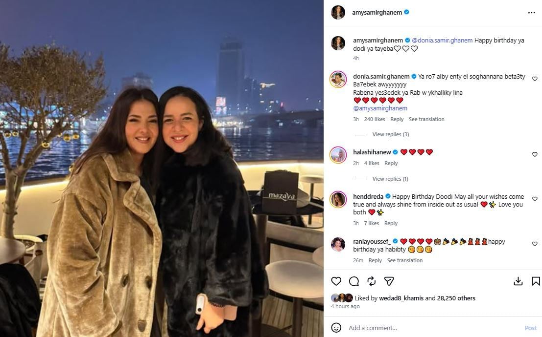حرصت النجمة إيمي سمير غانم على تهنئة شقيقتها دنيا سمير غانم بعيد ميلادها، حيث شاركت صورة تجمعها بها على حسابها على إنستجرام، وعلقت قائلة: عيد ميلاد سعيد يا دودي يا طيبة. وردت دنيا سمير غانم عليها في تعليق على المنشور قائلة: يا روح قلبي إنتى الصغننة بتاعتى، بحبك أوى وربنا يسعدك يا رب ويخليكي لينا.