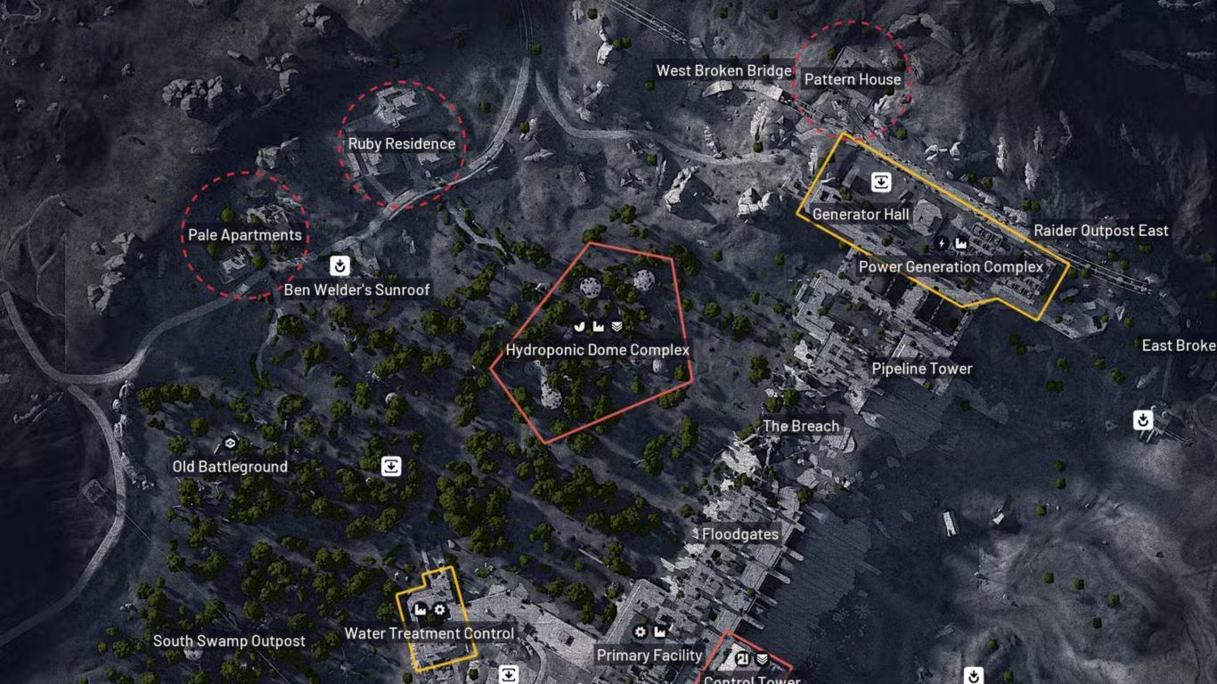 تقع هذه المباني في الزوايا الغربية والشمالية من خريطة Dam Battlegrounds وهو ما يمنحها ميزة إضافية من حيث سهولة الوصول. في حال بدأ اللاعب الجولة بالقرب من هذه المناطق يمكنه التوجه مباشرة إليها دون الحاجة إلى عبور مناطق مفتوحة أو التعرض لمخاطر غير ضرورية. هذا الأمر يقلل من احتمالية الاشتباك مع وحدات ARC ويجعل عملية الجمع أكثر أمانا.
