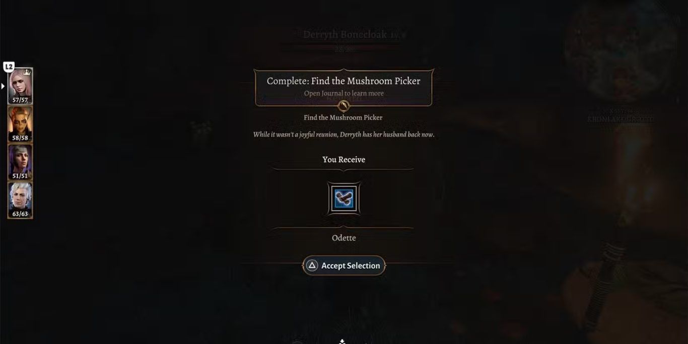 بعد إتمام عملية إنقاذ Baelen وعودته سالما يصبح من الضروري الرجوع مرة أخرى إلى Derryth والتحدث معها داخل مستعمرة myconid في منطقة Ebonlake Grotto. هذا الحوار يمثل الخاتمة الفعلية لمهمة Find the Mushroom Picker ويغلق الخط السردي المرتبط باختفاء زوجها داخل عالم Underdark. ورغم أن Derryth لم تعد اللاعب منذ البداية بأي مكافأة مقابل سلامة زوجها إلا أن العودة إليها بعد إنقاذه تظل خطوة أساسية لإكمال المهمة بالكامل.