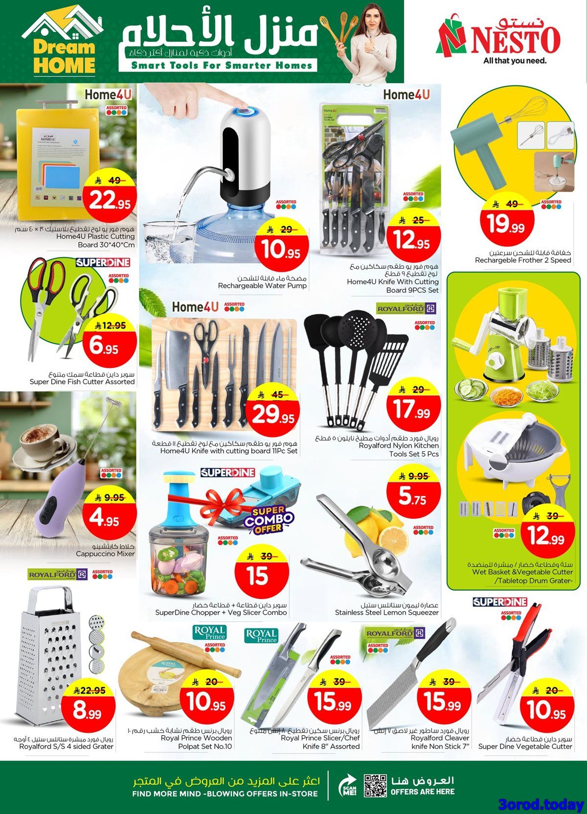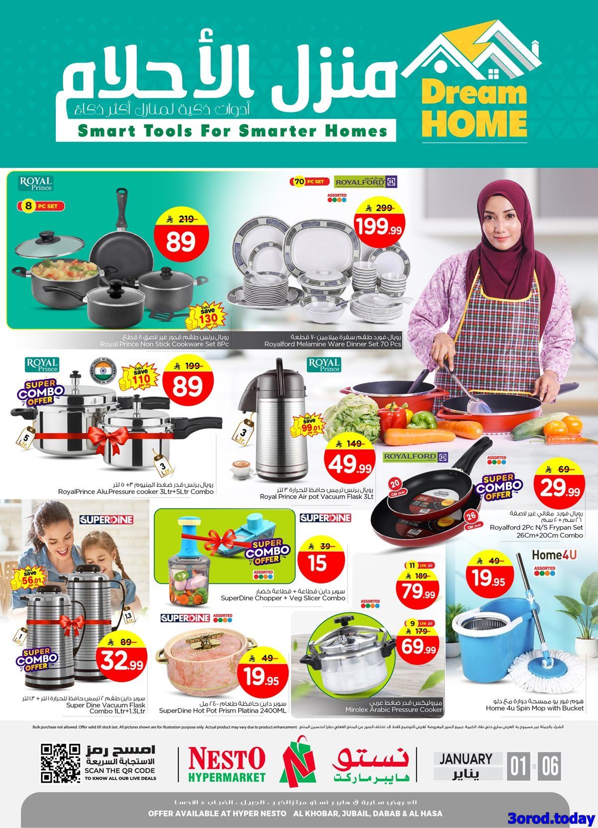 تحتوي عروض نستو الدمام الجمعة 2-1-2026 الموافق 13 رجب 1447هـ تشكيلة من الأواني والمقالي المنزلية من مجموعات رويال دورا ورويال شيف والألومنيوم والكومبوزيت مع أواني الطهي بأشكال متنوعة و تشمل أيضا الترموسات والأدوات الكهربائية والمكاوي والخلاطات باسعار تنافسية