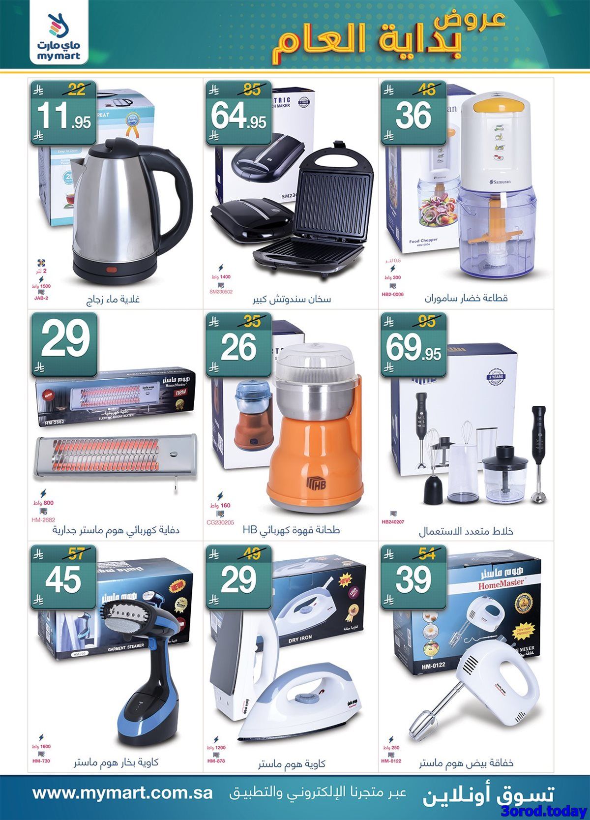 تخفيضات ماي مارت هذا الاسبوع الجمعة 2 يناير 2026 الموافق 13-7-1447هـ و تشمل علي مجموعات الأطباق والصحون والترموسات المعدنية والزجاجية والغلايات بأشكال متنوعة و بتوفر أيضا الأجهزة الكهربائية والكراسي والمنظفات منها الغلايات والشوايات والخلاطات والمطاحن والمكاوي والكراسي الملونة والمدفات