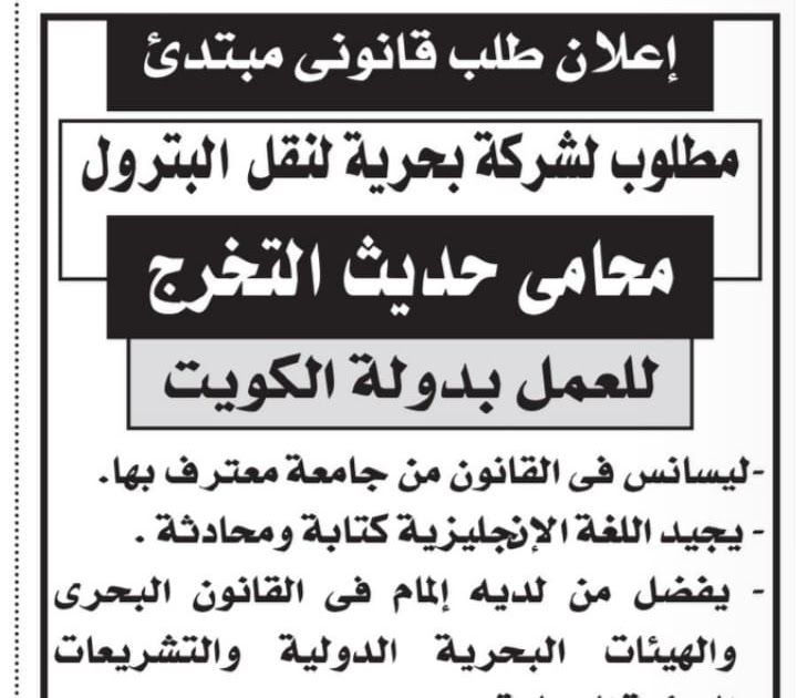 إعلان طلب قانوني مبتدئ مطلوب لشركة بحرية لنقل البترول محامى حديث التخرج للعمل بدولة الكويت