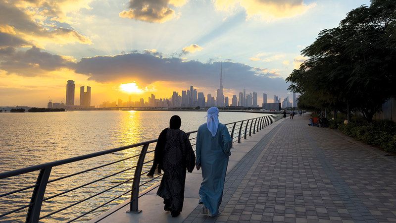 يخرج السكان والزوار لاغتنام فرصة ذهبية في دبي هذه الأيام، حيث المشي يصير متعة حقيقية مع اعتدال الطقس ونسمات الهواء اللطيفة في الشوارع والشواطئ التي تعج بالحياة، وحيث دفء الشمس الخفيف مع زرقة السماء الصافية.. هي لحظات بسيطة تمنح إحساساً بالراحة، وتجعل المشي في أجواء دبي الحالية فرصة مثالية للاستمتاع بجمال المدينة على مهل، حيث يظهر في الأفق برج خليفة من ممشى الجداف في منطقة خور دبي.