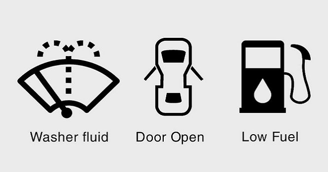 11- نقص سائل المسّاحات، وباب أو صندوق مفتوح، وانخفاض الوقود (والسهم الصغير يحدد جهة فتحة التعبئة)
