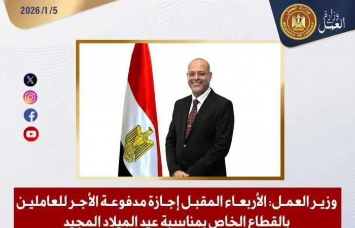 أعلن وزير العمل محمد جبران اليوم الاثنين، أن يوم الأربعاء المقبل الموافق 7 يناير 2026، إجازة رسمية مدفوعة الأجر، بمناسبة عيد الميلاد المجيد، وذلك للعاملين في شركات القطاع الخاص المخاطبين بأحكام قانون العمل الصادر بالقانون رقم 14 لسنة 2025.