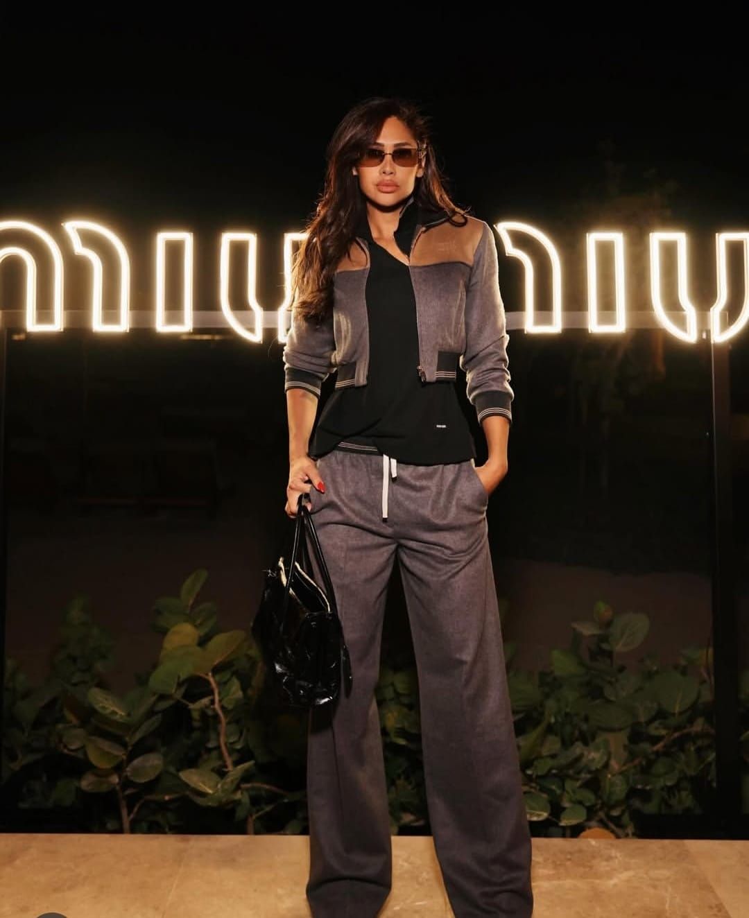 وظهرت إنجي كيوان ببدلة كاجوال أنيقة باللون الرمادي الداكن، مزينة بتفاصيل جلدية عند الأكتاف، منسقة مع توب أسود وحقيبة جلدية سوداء، ما أضفى على الإطلالة لمسة من الفخامة، واختارت النظارات الشمسية الصغيرة لتكمل بها اللوك العصري، في توازن ذكي بين الراحة والأناقة.