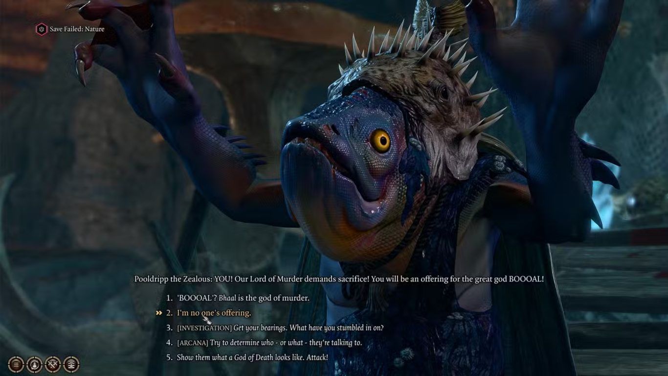 تقدم Baldur’s Gate 3 مجموعة واسعة من المسارات التفاعلية التي تمكّن اللاعب من كشف الطبيعة الحقيقية للإله الزائف BOOOAL حيث يرتبط هذا الاكتشاف بشكل مباشر بخيارات الحوار التي يتخذها اللاعب وبمدى قدرته على اجتياز اختبارات المهارات المختلفة أثناء التفاعل مع أحداث The Festering Cove.