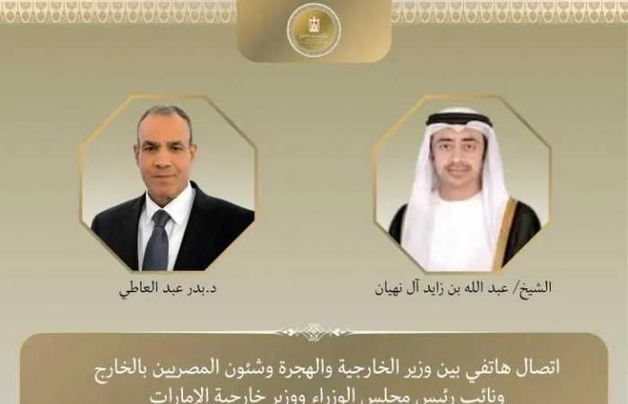 جرى اتصال هاتفي بين د. بدر عبد العاطي وزير الخارجية والهجرة وشئون المصريين بالخارج، وسمو الشيخ عبد الله بن زايد آل نهيان نائب رئيس مجلس الوزراء وزير الخارجية بدولة الإمارات العربية المتحدة الشقيقة يوم الاثنين ٥ يناير وذلك في إطار التشاور والتنسيق المستمر بين البلدين الشقيقين إزاء سبل دعم العلاقات الثنائية، وبحث عدد من القضايا الإقليمية ذات الاهتمام المشترك.