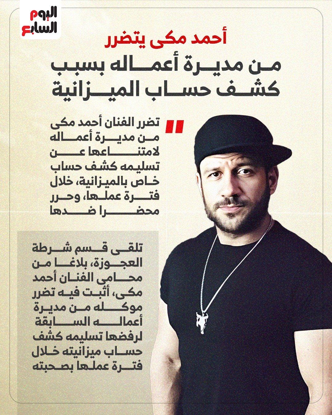 الثلاثاء، 06 يناير 2026 01:35 متضرر الممثل أحمد مكى من مديرة أعماله بسبب كشف حساب الميزانية، اليوم السابع يكشف تفاصيل الأزمة في الإنفو جراف التالي: