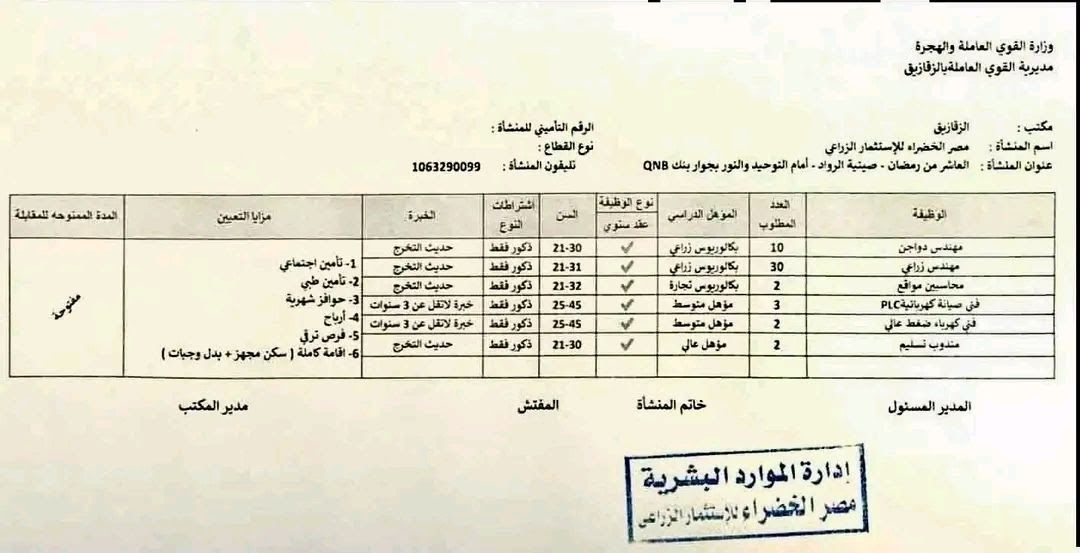 اعلان مديرية القوي العاملة بالزقازيق شركة مصر الخضراء للاستثمار الزراعي