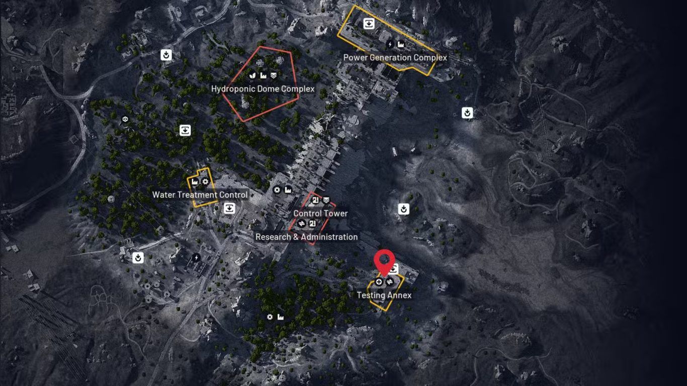 تمنح طبيعة Testing Annex الطبية هذا الموقع أفضلية واضحة مقارنة ببقية مناطق الخريطة إذ ترتفع داخله احتمالية العثور على الأدراج الطبية والحاويات المرتبطة بعناصر الشفاء والمخططات الطبية النادرة التي يحتاجها اللاعب للبقاء في الجولات عالية الخطورة.