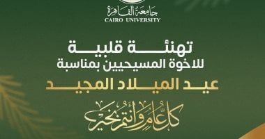 تقدم الدكتور محمد سامي عبد الصادق رئيس جامعة القاهرة، باسم مجلس الجامعة وأعضاء هيئة التدريس والعاملين، بخالص التهنئة القلبية لقداسة البابا تواضروس الثاني بابا الإسكندرية وبطريرك الكرازة المرقسية، وجميع الإخوة المسيحيين من جموع الشعب المصري ومن أعضاء هيئة التدريس والعاملين والطلاب بمناسبة عيد الميلاد المجيد، سائلا الله أن يعيده عليهم وعلى مصرنا الحبيبة بكل الخير والسلام فى ظل قيادة السيد الرئيس عبدالفتاح السيسي رئيس الجمهورية.