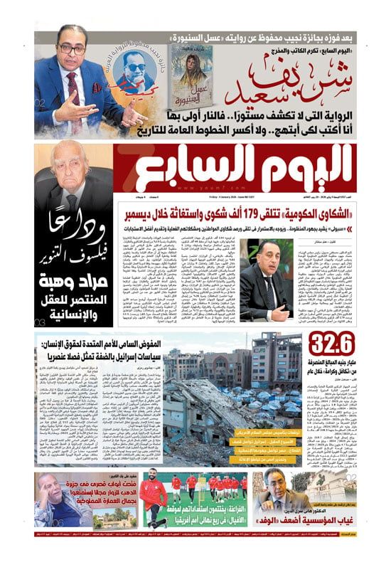 ينشر "اليوم السابع" فى عدده الصادر غدا الجمعة، تفاصيل هامة حول العديد من الأحداث الجارية على الساحتين الداخلية والخارجية أبرزها: اليوم السابع يكرم الكاتب والمخرج شريف سعيد بعد فوزه بجائزة نجيب محفوظ عن روايته عسل السنيورة: الرواية التى لا تكشف مستورا فالنار أولى بها.. أنا أكتب لكى أبتهج.. ولا أكسر الخطوط العامة للتاريخ.