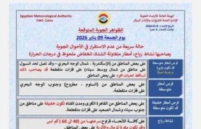 الظواهر الجوية المتوقعة اليوم الجمعة 9 يناير 2026