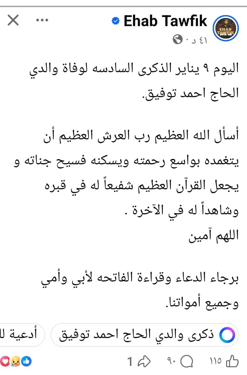كتب إيهاب توفيق: "اليوم 9 يناير الذكرى السادسة لوفاة والدي الحاج أحمد توفيق"، مردفاً بالدعاء: "أسأل الله العظيم رب العرش العظيم أن يتغمده بواسع رحمته ويسكنه فسيح جناته، ويجعل القرآن العظيم شفيعاً له في قبره وشاهداً له في الآخرة. اللهم آمين".
