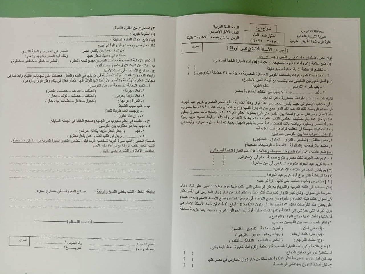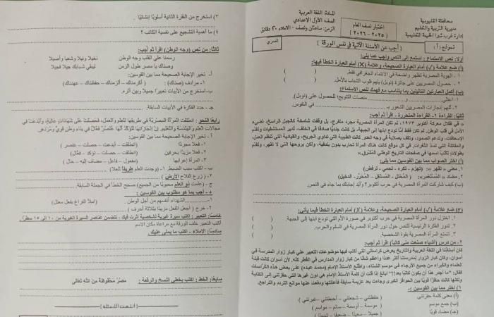 امتحان اللغة العربية للصف الأولى الإعدادي 2026