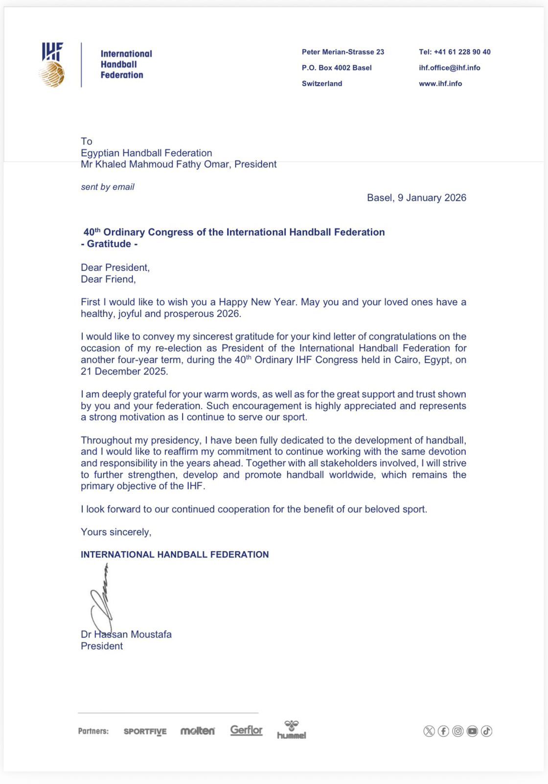 السبت، 10 يناير 2026 01:03 موجه الدكتور حسن مصطفى، رئيس الاتحاد الدولي لكرة اليد، رسالة شكر وتقدير إلى الاتحاد المصري لكرة اليد، برئاسة خالد فتحي ، وذلك ردًا على خطاب التهنئة الذي تلقاه بمناسبة إعادة انتخابه رئيسًا للاتحاد الدولي لكرة اليد لفترة جديدة مدتها أربع سنوات.