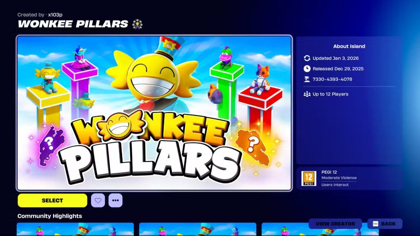 تتيح لعبة Fortnite من خلال طور Creative إمكانية الوصول المباشر إلى خرائط مخصصة عبر استخدام أكواد الجزر حيث يمكن للاعبين العثور على خريطة Wonkee Pillars عن طريق التوجه إلى تبويب Discovery ثم إدخال كود الجزيرة 7330 4393 4078 ليتم عرض الخريطة بشكل مباشر ضمن نتائج البحث المتاحة داخل اللعبة.