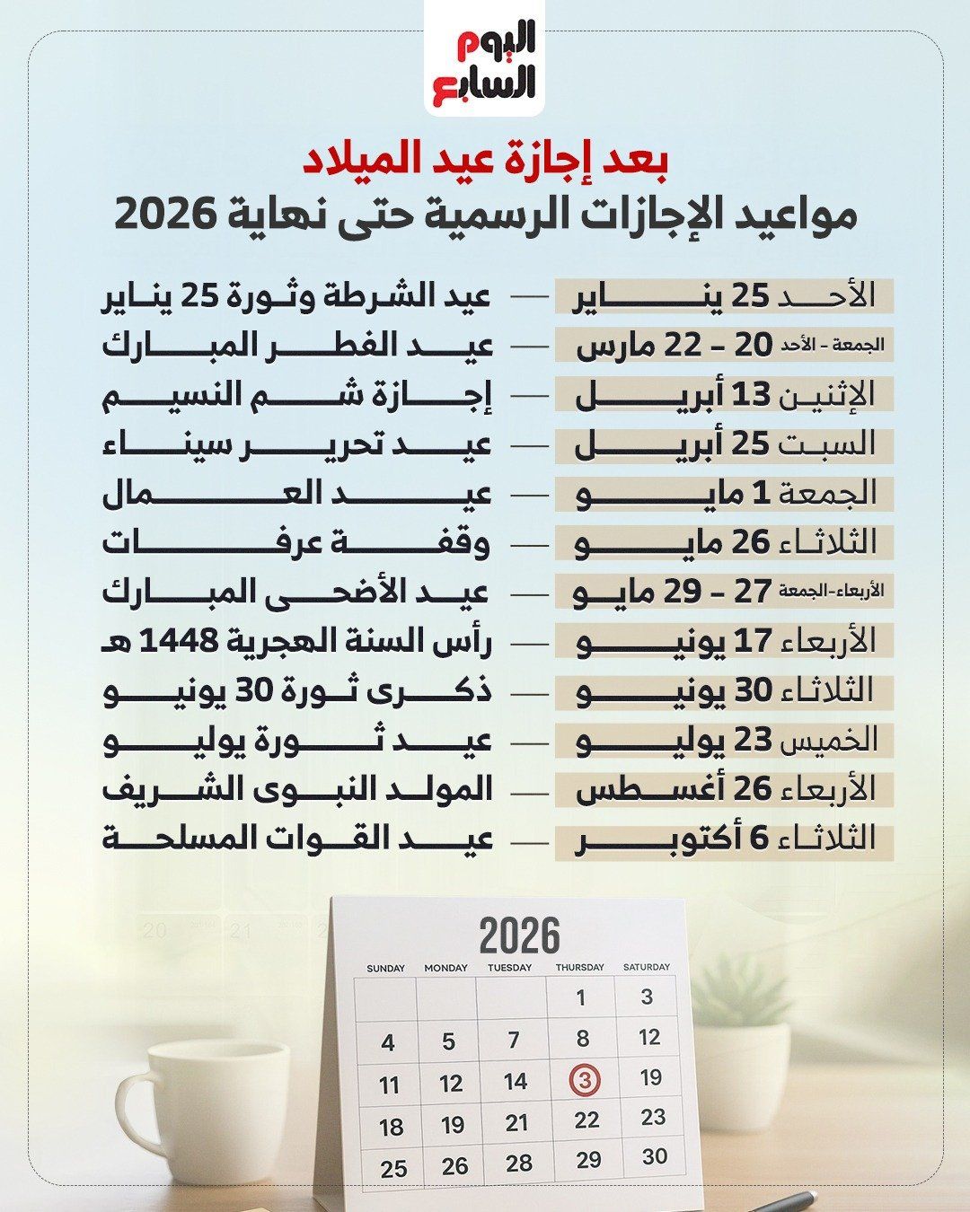 مواعيد الإجازات الرسمية حتى نهاية 2026 باليوم والتاريخ.. إنفوجراف