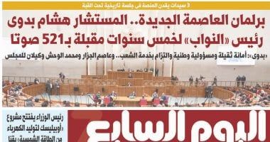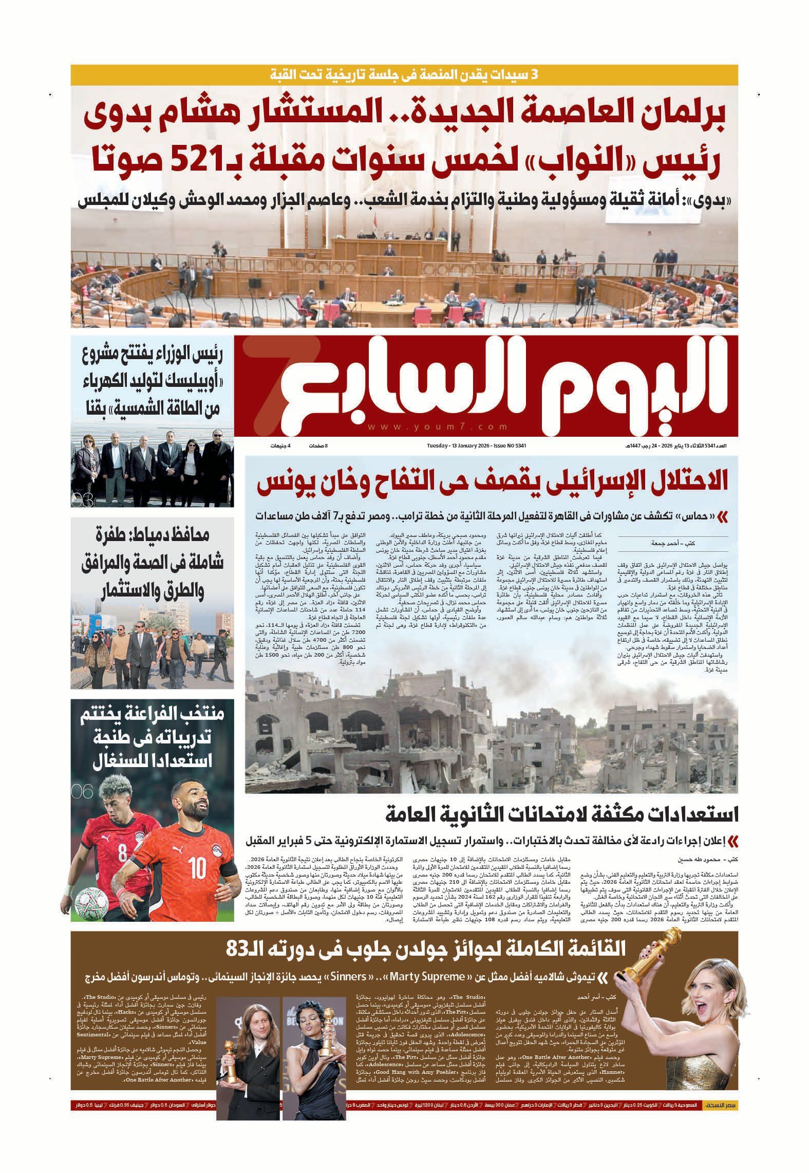 ينشر "اليوم السابع" فى عدده الصادر غدا، تفاصيل هامة حول العديد من الأحداث الجارية على الساحتين الداخلية والخارجية أبرزها: 3 سيدات يقدن المنصة فى جلسة تاريخية تحت القبة.. الاحتلال الإسرائيلى يقصف حى التفاح وخان يونس.. «حماس» تكشف عن مشاورات فى القاهرة لتفعيل المرحلة الثانية من خطة ترامب.. منتخب الفراعنة يختتم تدريباته فى طنجة استعدادا للسنغال