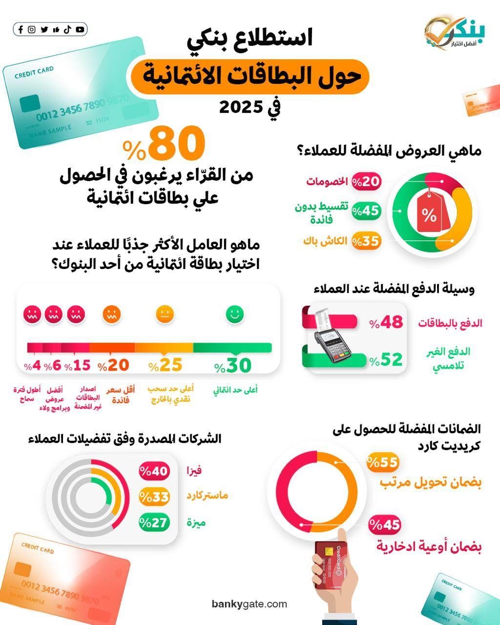 أجرى موقع “بنكي” استطلاع رأي موسع لقياس توجهات وتفضيلات قرائه ومتابعيه بشأن بطاقات الائتمان، والعوامل الأكثر تأثيرا في قرار اختيار البطاقة الأنسب خلال عام 2025، بما يعكس تطور سلوك العملاء وتغير أولوياتهم في التعاملات المالية اليومية؛ في ظل التوسع المتسارع في استخدام المدفوعات الإلكترونية وتنامي الاعتماد على الحلول المصرفية الرقمية.