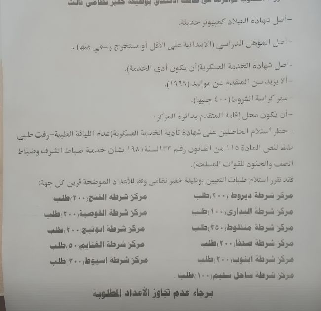 مديرية أمن أسيوط قسم شئون الافراد إخطار عام للمراكز بمناسبة البدء فى تلقى طلبات الترشيح فى وظيفة خفير نظامی ثالث يتنبه بالاتي :