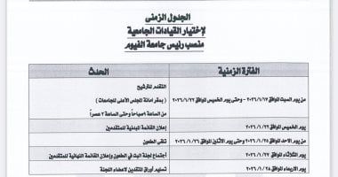 أعلن المجلس الأعلى للجامعات الجدول الزمنى للجنة اختيار القيادات الجامعية وفتح باب الترشح لمنصب رئيس جامعة الفيوم ، لتبدأ يوم السبت المقبل 17 يناير ويستمر إتاحة التقدم حتى يوم الخميس 22 يناير الجارى.