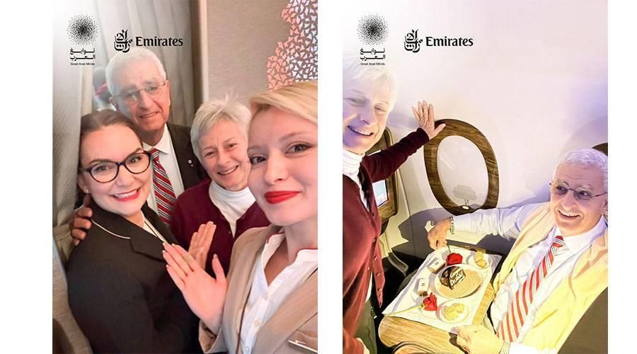 وقدّم طواقم طيران الإمارات في الجو خلال الرحلة قالباً من الحلوى مزيّناً باسم الفائز احتفاءً بتواجده على متنها، كما التقطوا الصور التذكارية معهم وشاركوها في النشرات الدورية ومنشورات صفحات التواصل الاجتماعي لطيران الإمارات في مختلف أنحاء العالم.