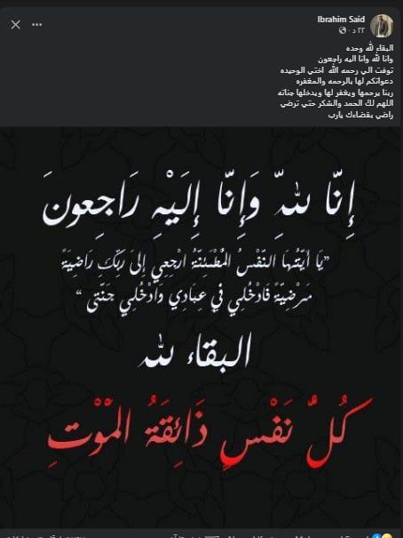 وكتب إبراهيم سعيد" البقاء لله وحده وانا لله وانا اليه راجعون توفت الي رحمه الله  اختي الوحيده دعواتكم لها بالرحمه والمغفره ربنا يرحمها ويغفر لها ويدخلها جناته اللهم لك الحمد والشكر حتي ترضي راضي بقضاءك يارب".