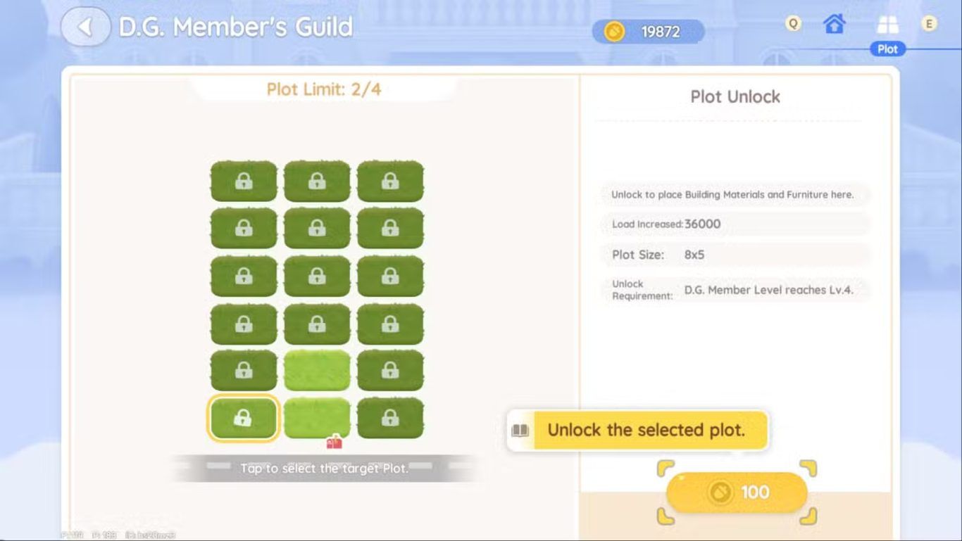 تتم عملية شراء قطع السكن من خلال الدخول إلى تبويب Plot داخل تطبيق D G Members Guild المتاح على الساعة الخاصة باللاعب حيث يعرض هذا التبويب جميع قطع الأراضي القابلة للشراء بالقرب من الملكية الحالية.