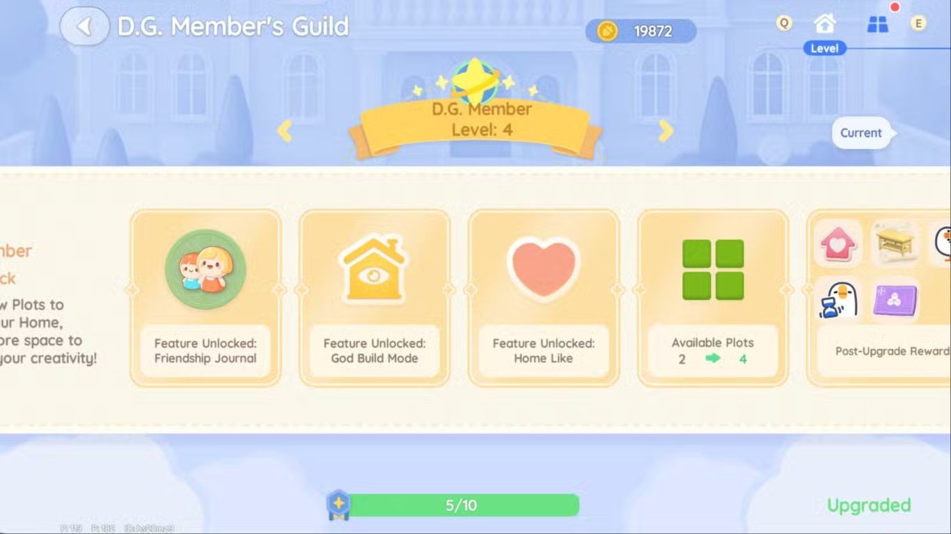 تمنح بعض الرتب ميزة خاصة تسمى D G Member plot unlock perk والتي تسمح بزيادة عدد قطع السكن المتاحة للاعب وهو ما يفتح المجال لاستغلال مساحات إضافية للبناء والتزيين.