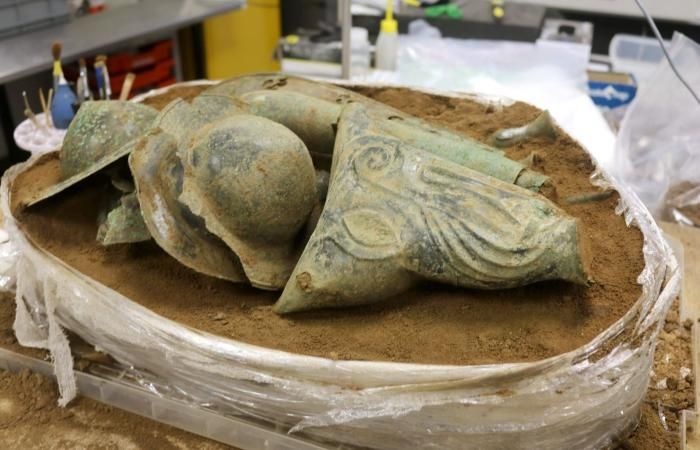 قام الفريق برفع القطع بعناية من الموقع، إذ كانت مغلفة داخل كتلة من التربة.