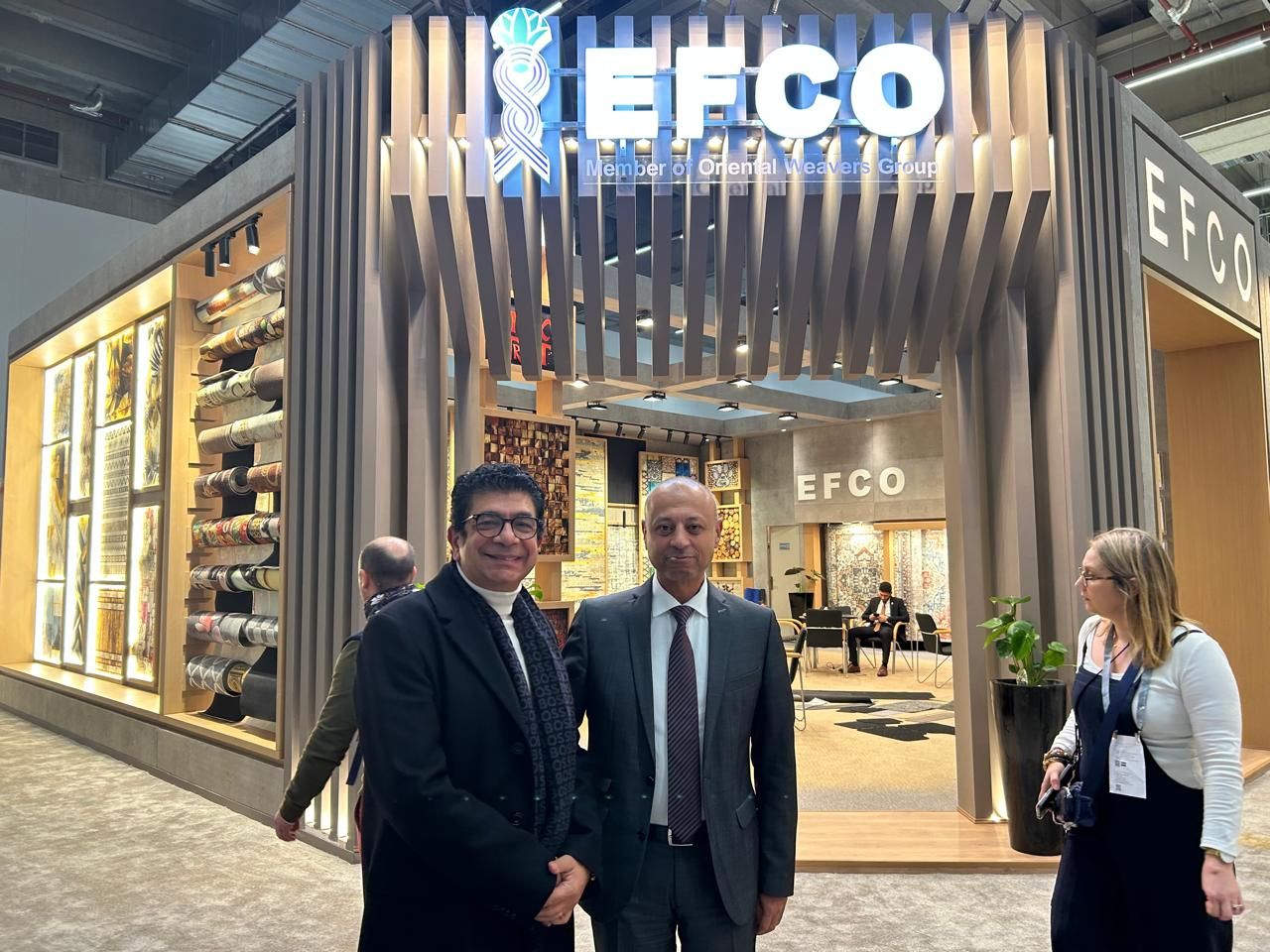 كما التقي الوفد ياسمين فريد خميس، رئيس مجموعة النساجون الشرقيون، وأشاد بالجناح الكبير المتميز في صالة 12 والإقبال الكبير على السجاد المصري المتميز والمعروض.