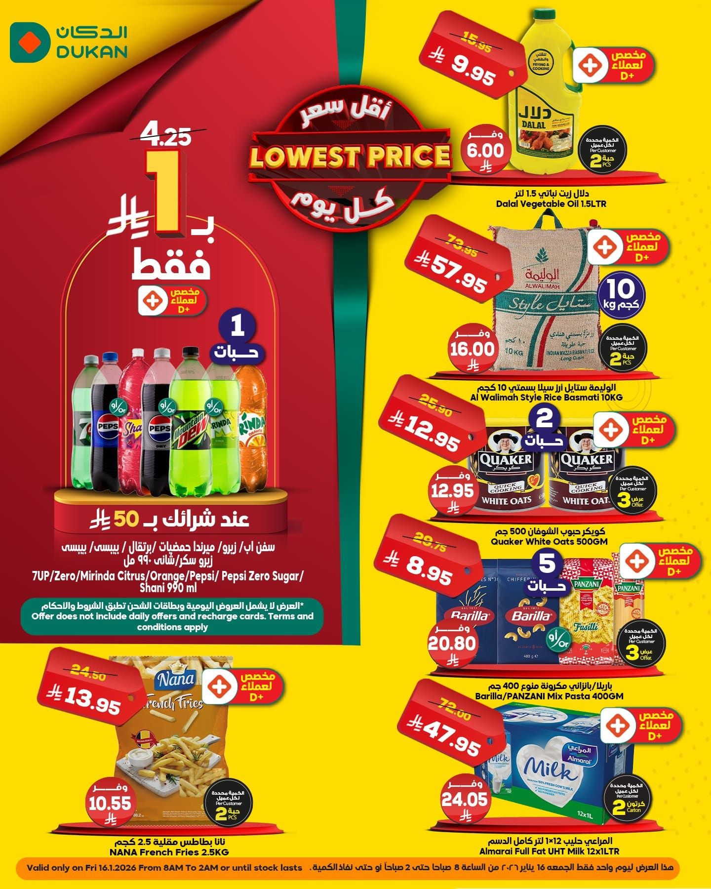 الدكان الخاصة 16 يناير 2026 خربناها على الآخــــر على منتجات مختارة بأفضل الاسعار التي سوف تشاهدونها ضمن عروض نهاية الاسبوع في جميع فروع الدكان على المواد الغذائية العرض ليوم واحد فقط الجمعه 16 يناير 2026 من الساعة 6 صباحاً أو لحين تنفد الكمية