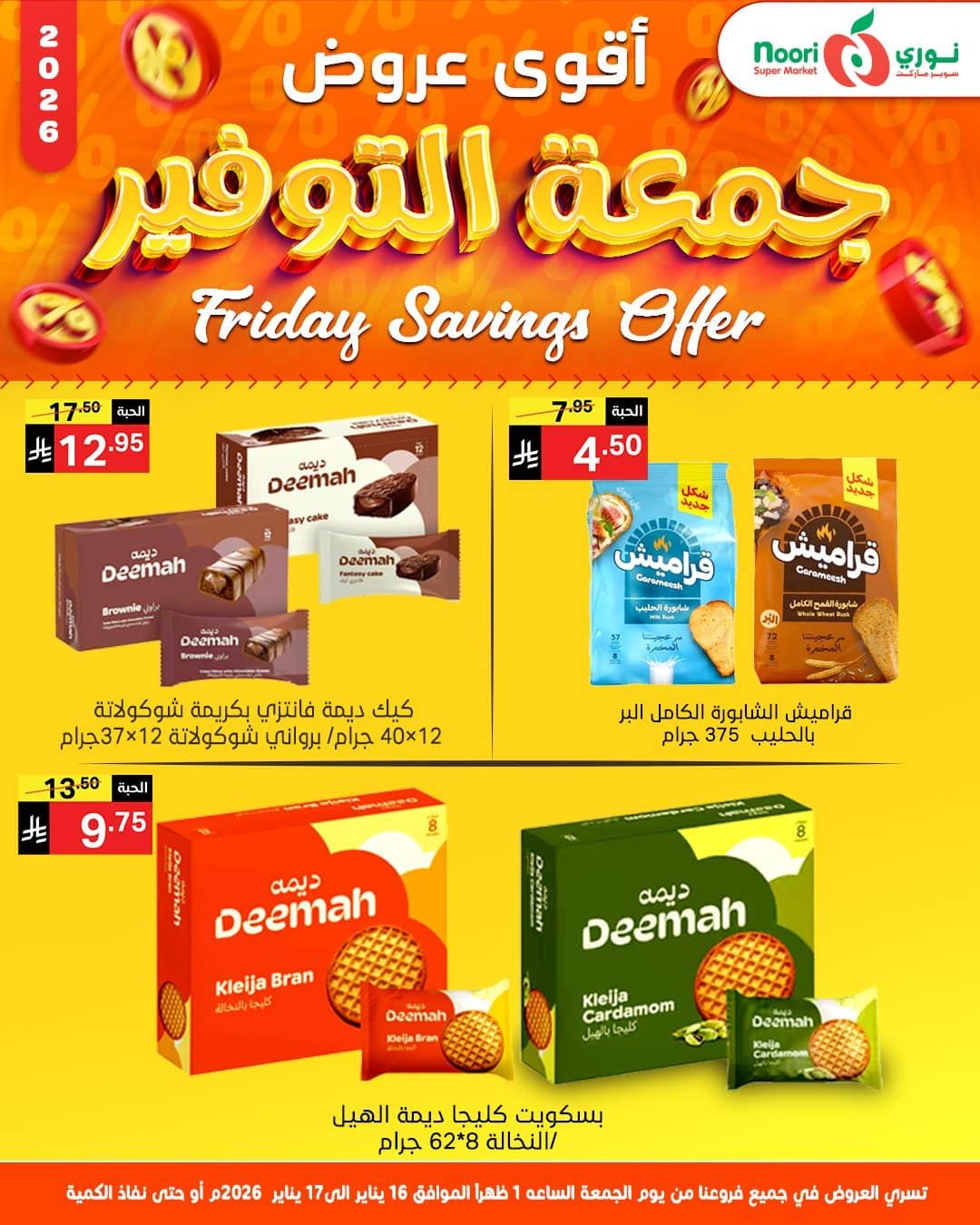 عروض نوري سوبر ماركت يومي 16-17 يناير 2026 جمعة التوفير منتجات متنوعة و اسعار منافسة ضمن عروض نهاية الاسبوع في اسواق نوري ضمن جميع الفروع في المملكة لا تفوتوا هذا العرض الذي يبدأ في من يوم الجمعة الساعة 01 ظهراً 16 يناير الى يوم السبت 17 يناير2026م استفيدوا من اقوى العروض.