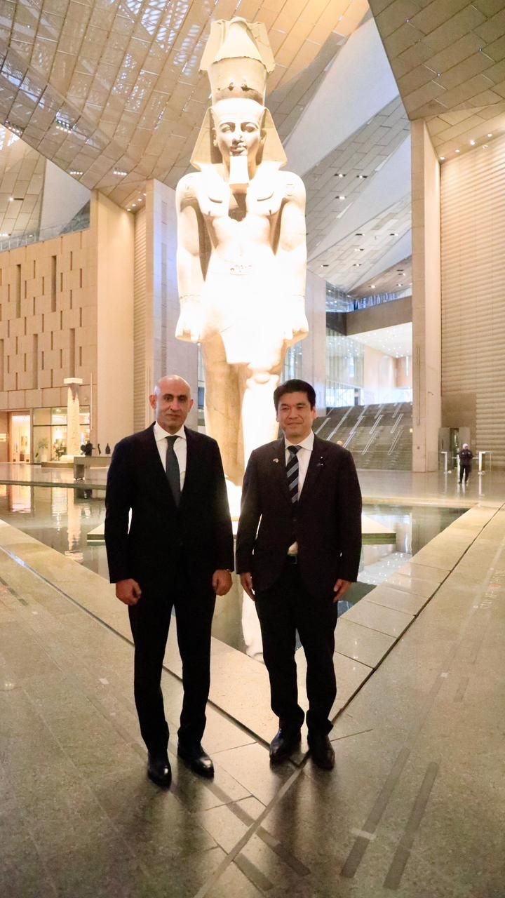 ورافق الوزيران خلال زيارة المتحف المصري الكبير، السفير إيواي فوميو سفير اليابان بالقاهرة، وممثلين عن السفارة اليابانية بالقاهرة وأعضاء هيئة الجايكا اليابانية.وتأتي هذه الزيارة تأكيدًا لعمق الشراكة المصرية-اليابانية، حيث اطّلع الوزيران على مقتنيات المتحف وما يزخر به من كنوز أثرية فريدة، كما جرى استعراض مراحل تنفيذ المتحف والدور المحوري للدعم الياباني الموجّه له، بما يعكس التزام اليابان الراسخ بدعم جهود حماية وصون التراث الثقافي الإنساني.