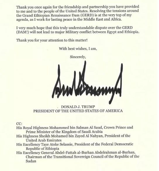 واختتم الرئيس الأمريكى دونالد ترامب رسالته بالتأكيد على أن حل التوترات المتعلقة بسد النهضة الإثيوبى يأتى فى صدارة أولوياته، معربًا عن أمله فى ألا يؤدى الخلاف القائم إلى صراع عسكري بين مصر وإثيوبيا، ومؤكدًا حرصه على تحقيق سلام دائم فى الشرق الأوسط وأفريقيا.