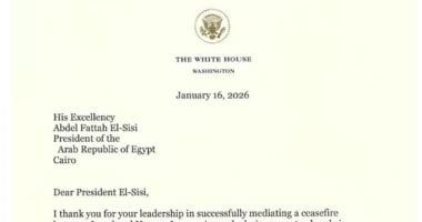 وأعرب ترامب، فى نص رسالته، عن شكره للرئيس السيسى على «القيادة الناجحة» فى التوصل إلى وقف لإطلاق النار، مثمنًا الدور الثابت لمصر فى التعامل مع تداعيات الحرب منذ 7 أكتوبر ، وما تحمله الشعب المصرى من أعباء هذه التطورات.