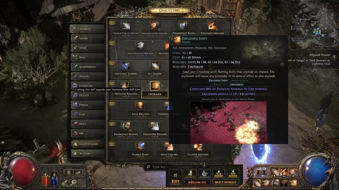 تعد Explosive Shot من أقوى مهارات Crossbow في Path of Exile 2 حيث تعمل كمهارة Detonator تسمح بتفجير القنابل والشظايا الجليدية والجدران الجليدية وغيرها من التأثيرات المشابهة بشكل يدوي مما يمنح اللاعب تحكما كاملا في توقيت الانفجار ويجعلها أداة مدمرة لتنظيف مجموعات الأعداء والقضاء على الزعماء بكفاءة عالية خاصة عند دمجها مع بناء يعتمد على القنابل والتفجيرات المتسلسلة.