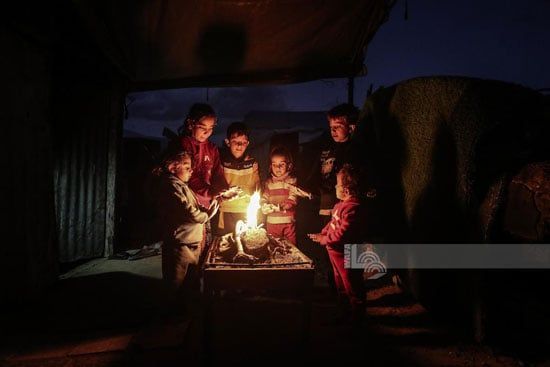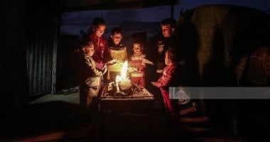 الأطفال يلتفون حول النار للتدفئة من برد الشتاء القارس