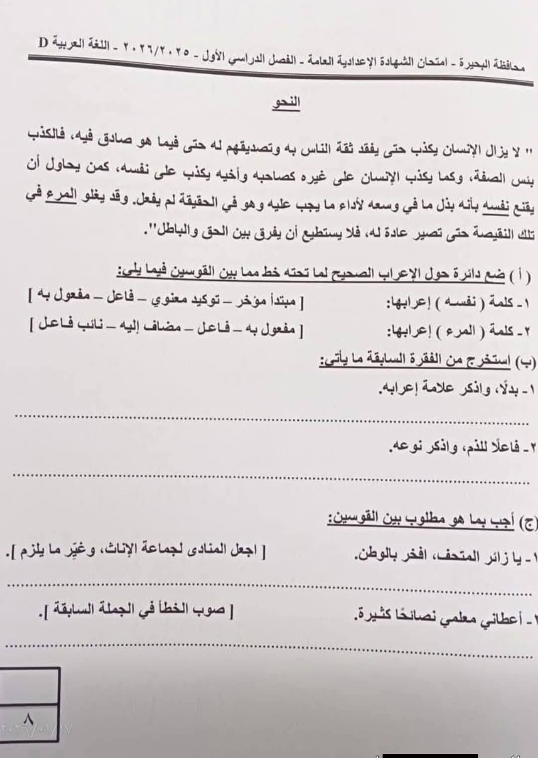 ويمكن التأكد من إجابات طلاب الشهادة الإعدادية من خلال معرفة حل امتحان مادة اللغة العربية الترم الأول 2026 البحيرة، من خلال مطالعة الصور التالية والتأكد من الدرجة التي يحصل عليها الطالب، وفقا لحله.
