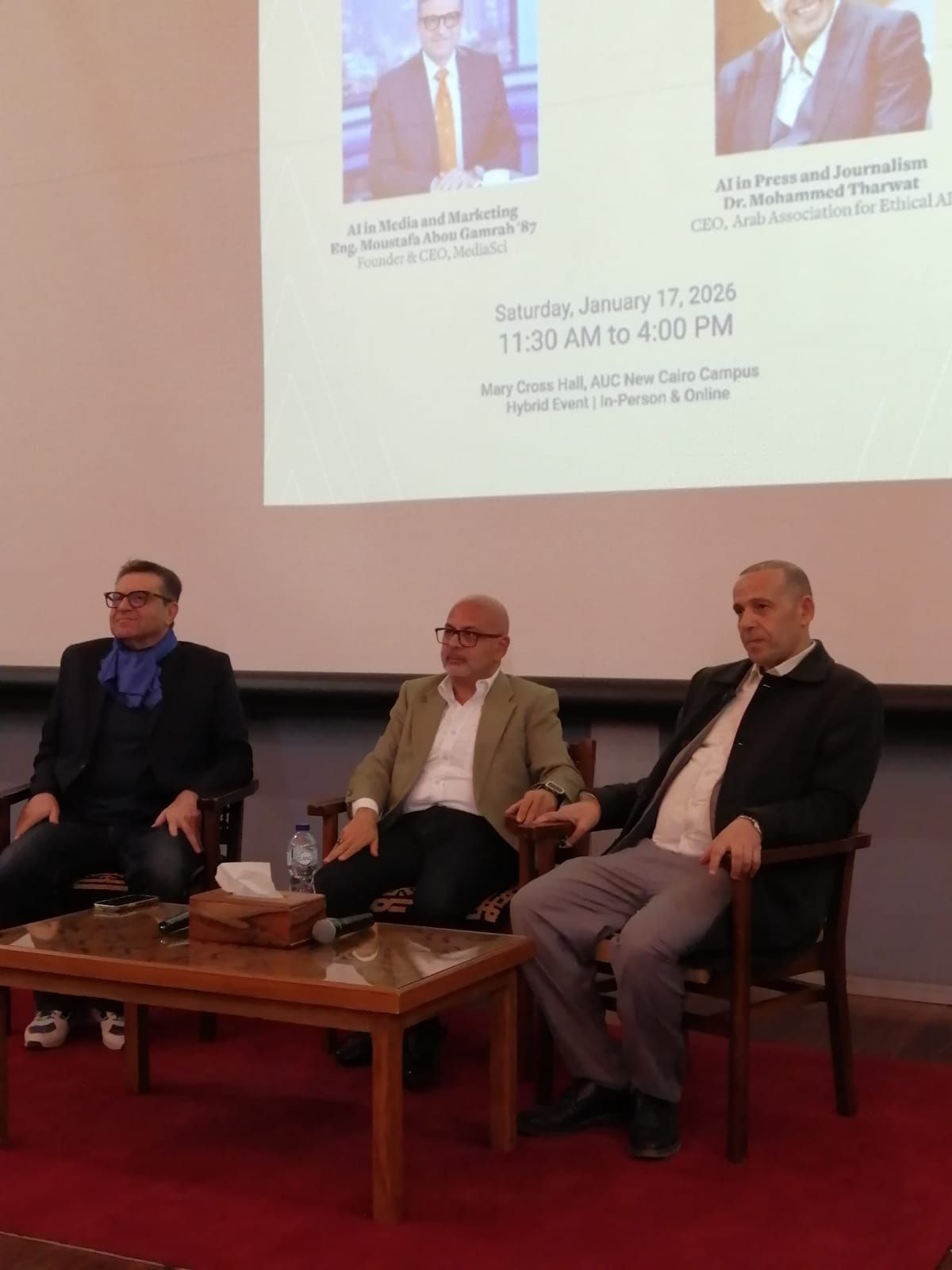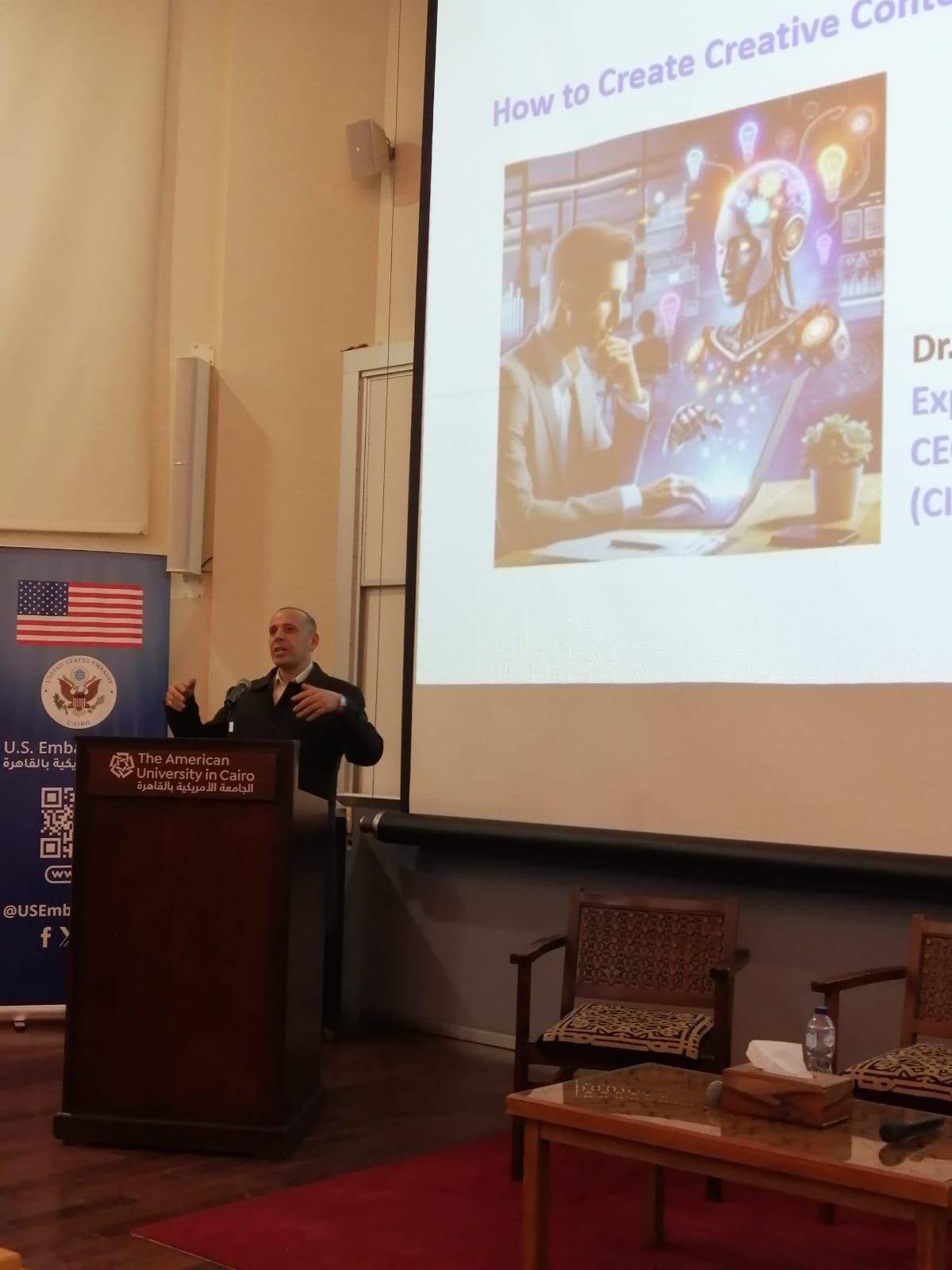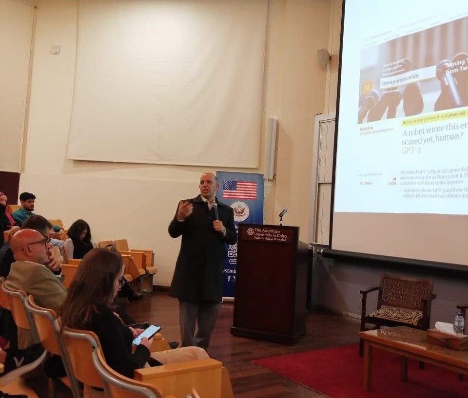 أطلق مجلس خريجي السفارة الأمريكية في القاهرة، بالتعاون مع مكتب علاقات الخريجين بالجامعة الأمريكية بالقاهرة، سلسلة بناء القدرات بعنوان «الذكاء الاصطناعي عبر المهن» في الجامعة الأمريكية بالقاهرة، بحضور الوزير المفوض للدبلوماسية العامة روبن هاروتونيان، والبروفيسور أحمد دلال رئيس الجامعة الامريكية بالقاهرة، وحاضر فيها كلا من الدكتور محمد ثروت الخبير بالإعلام الرقمي، والدكتور مصطفى غفرة الخبير بالتسويق الرقمي.