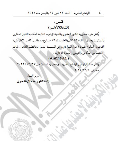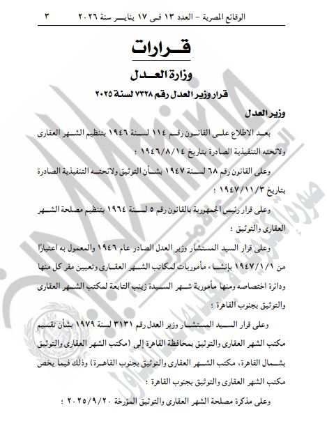 الأحد، 18 يناير 2026 09:59 صنشرت الجريدة الرسمية اليوم، قرار وزير العدل رقم 7328 لسنة 2025، والذي يتضمن نقل مقر مأمورية الشهر العقاري بالسيدة زينب، التابعة لمكتب الشهر العقاري والتوثيق بجنوب القاهرة، ليكون مقره مول المواردي، بحي السيدة زينب.