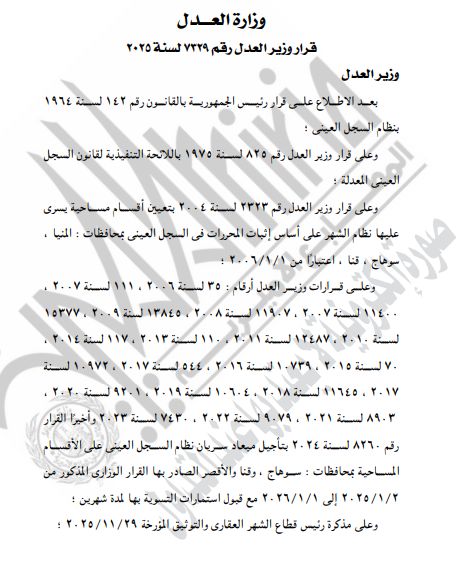قرار الجريدة الرسميةكما نشرت الجريدة الرسمية، قرار وزير العدل رقم 7329 لسنة 2025، والذي يتضمن تأجيل ميعاد سريان نظام السجل العيني على الأقسام المساحية بمحافظة قنا، في عددا من المراكز.