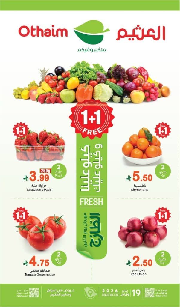 بنقدم ليكم احدث الاثنين 19 يناير 2026 الموافق 30-7-1447هـ مهرجان الطازج كيلو عليك و كيلو علينا تسوق ووفر اقوي المنتجات الغذائية و الخضروات و الفواكه الطازجة بجانب ذلك تشمل ايضا عروض اسواق العثيم اشهي اصناف اللحوم و اجهزة المطبخ الرائعة و باسعار مميزة مع توفير 1+1 مجانا لا تفوت الفرصة
