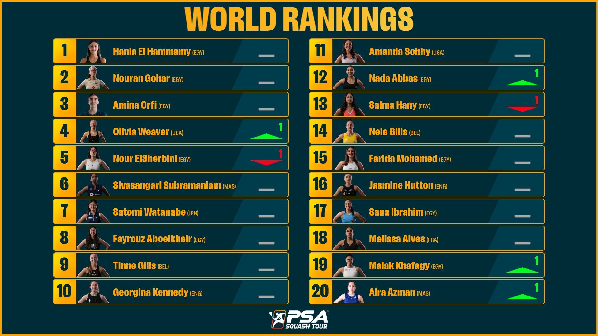 وتراجعت البطلة المصرية نور الشربيني مركزاً لتحتل التصنيف الخامس، فيما تقدم كريم عبد الجواد مركزاً ليحتل التصنيف الرابع.